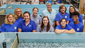 Conservation scientists pose for a photo with 2,500 newly arrived Lake Sturgeon at the Tennessee Aquarium Conservation Institute. Top Row: Hayley Martin, Kaylee Clayton, Dr. Bernie Kuhajda, Seth Little and Helaina Gomez. Bottom row: Avery Davis, Sarah Kate Bailey, Teresa Israel, Hailey Price and Garrett Guillard.