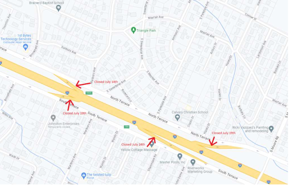 - CLOSE Entrance Ramp I-24 WB – North Terrace between Moore Rd. and Belvoir Ave.