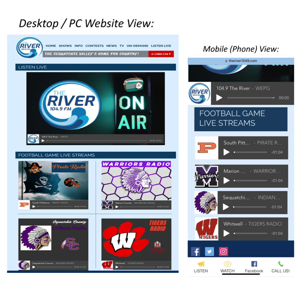 Both radio station websites offer streaming on your computer’s desktop or through your smart phone or tablet.  Visit theriver1049.com or countryroads933.com and click on the “LISTEN LIVE” tab…then find your team’s “radio player” and click the play button to listen live!