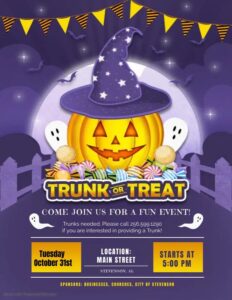 The City of Stevenson, AL, will be hosting a trunk or treat on Halloween beginning at 5 p.m. The event will take place on Main St. Please call Stevenson City Hall at 256-599-1290 to reserve a spot.