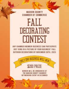 The Marion County Chamber of Commerce will have a Fall decorating contest. Any chamber member business can participate by sending in a picture of your business’s Fall outdoor decorating by November 30. Only one business will win the $200 prize. The winner will be announced at the Marion County Chamber networking event in December.