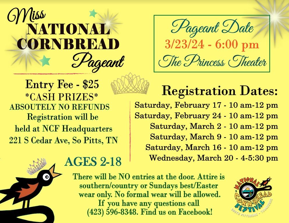 The Miss National Cornbread pageant will be held March 23 at 6:00 PM inside the Princess Theater in downtown South Pittsburg. Registration dates are Saturday, February 17, February 24, March 2, March 9, and March 16 from 10:00 AM until noon each day. The final day to register is Wednesday, March 20th, from 4:00 until 5:30 PM. Registration will be held at the National Cornbread Festival headquarters at 221 S Cedar Ave. in South Pittsburg.