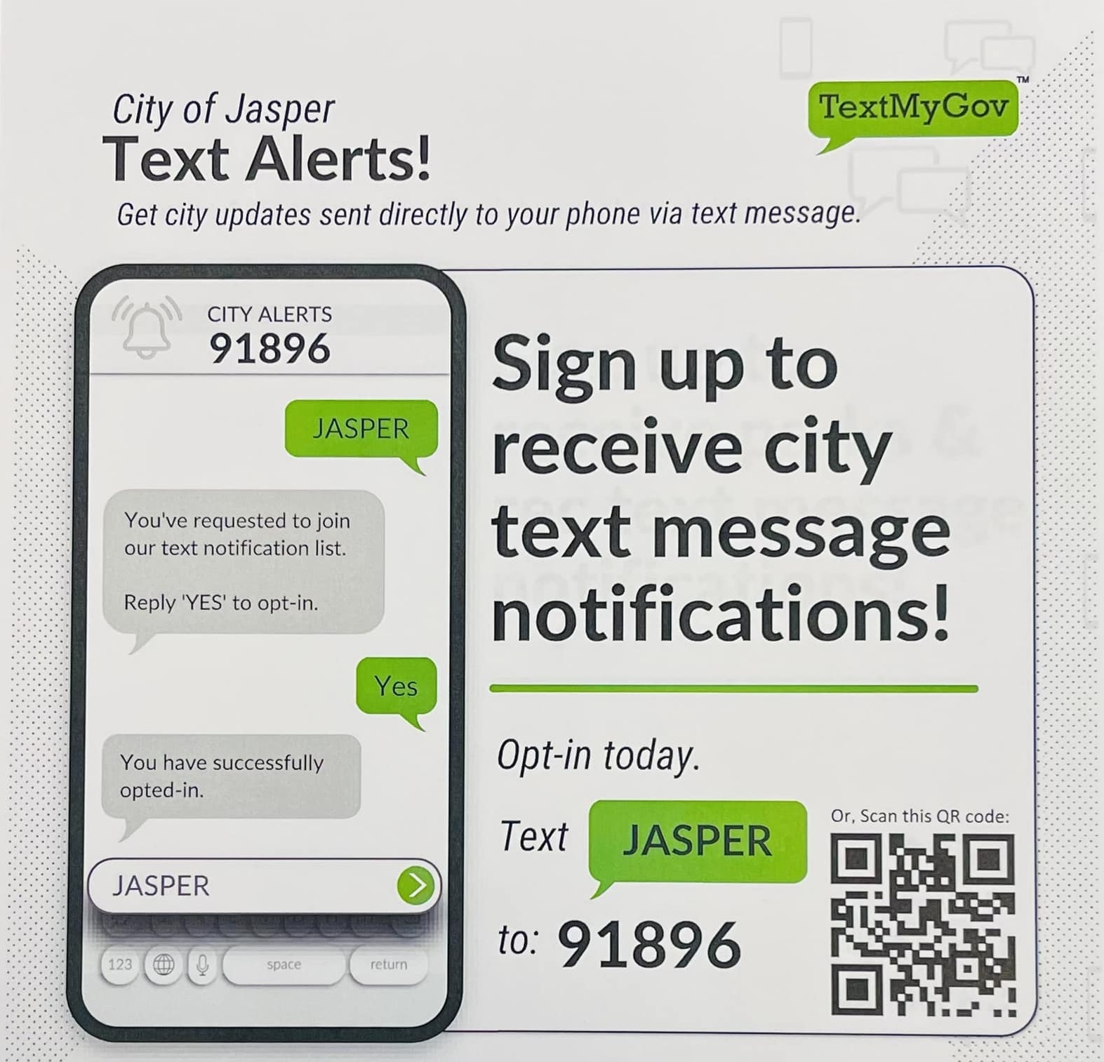 You can now sign up to receive text message notifications from the Town of Jasper, TN. Text 91896.