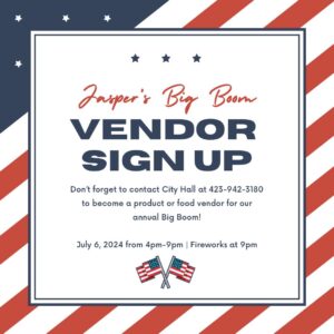Attention all vendors! The Town of Jasper needs you for their annual Big Boom celebration! Show off your products or your tasty food. Call the town hall to get signed up, 423-942-3180. The event will take place from 4 PM-9 PM on July 6.