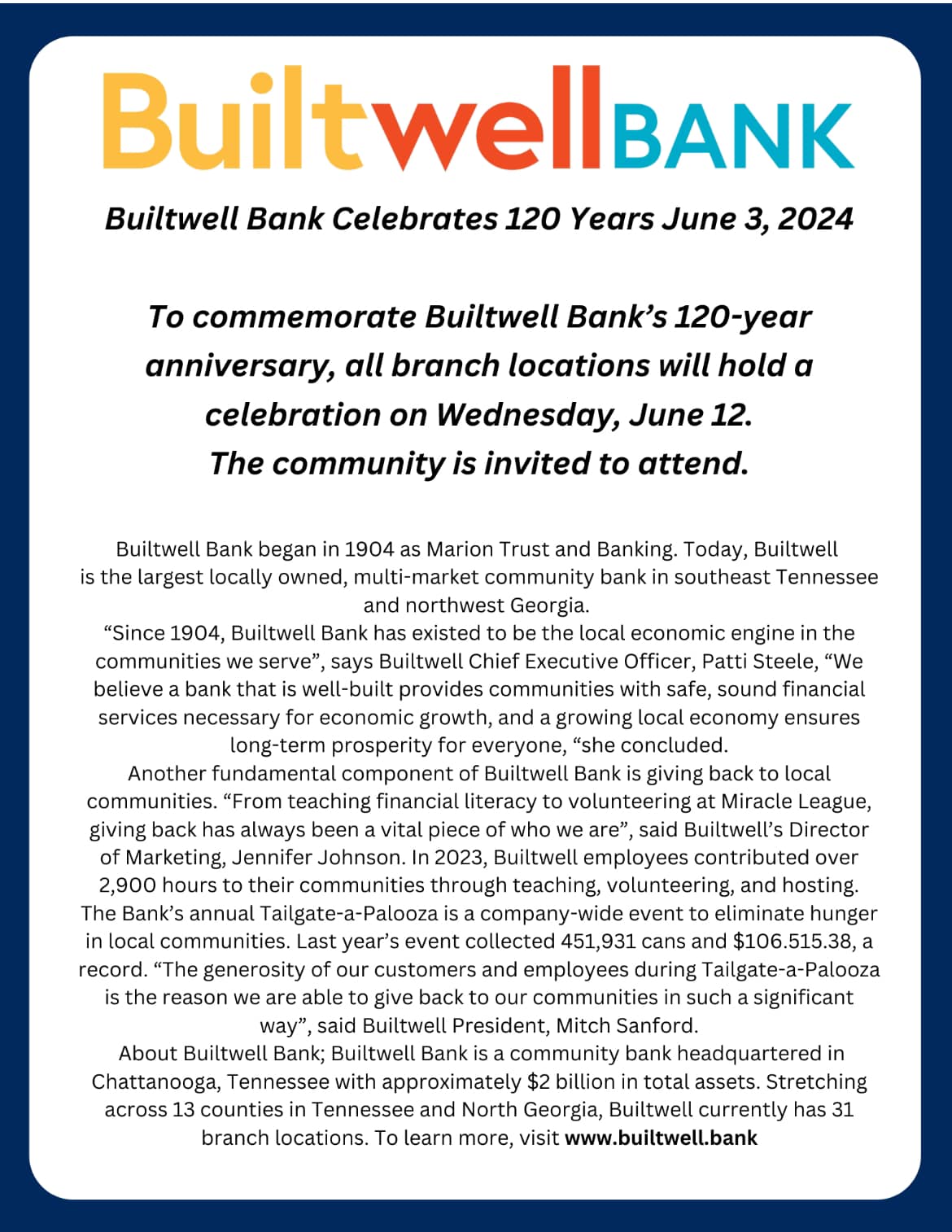 Builtwell Bank began in 1904 as Marion Trust and Banking. Today, Builtwell is the largest locally owned, multi market community bank in SE Tennessee and northwest Georgia.