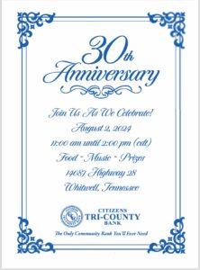 There will be food, music, and prizes. The celebration will take place at Citizens Tri-County Bank at 14087 Hwy. 28 in Whitwell. Make your plans to join them to celebrate 30 years of serving the community.