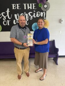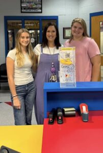 (Left) Interact Club members with MCHS Principal, Dr. Larry Ziegler and donated device; (Center) Jasper Middle Principal, Dr. Heath Thacker and Assistant Principal Kasey Woodlee with donated device; (Right) Club members with Jasper Elementary Principal Nicole Jones and donated device. Photos from MCHS Interact Facebook page…