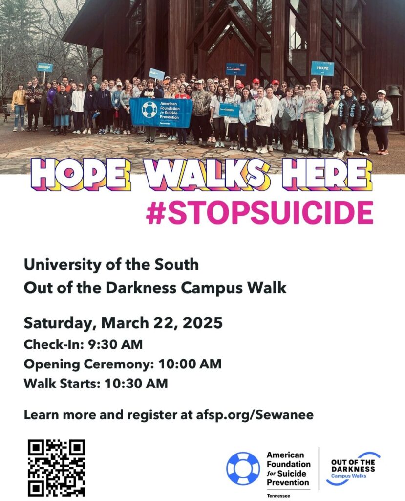 The University of the South (Sewanee) Campus Walk for the American Foundation for Suicide Prevention-Tennessee Chapter will be held on March 22. You can register to walk at afsp.org/Sewanee