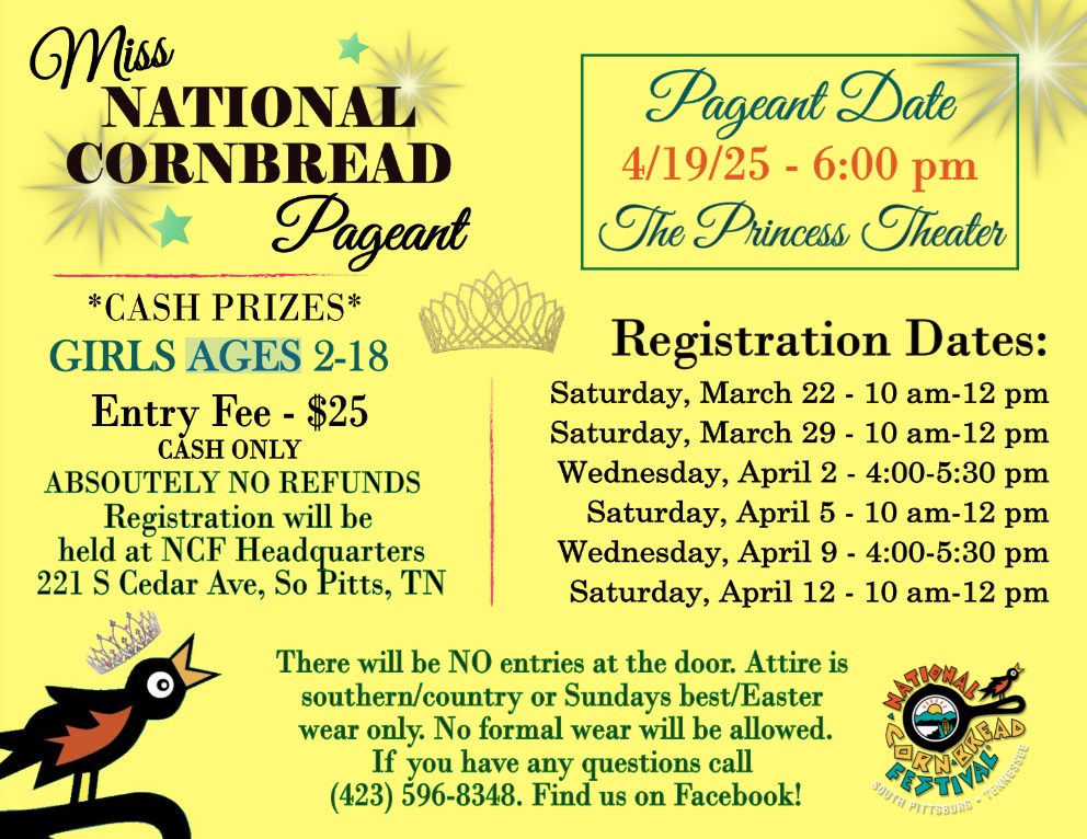 The Miss National Cornbread Festival pageant will be held on April 19 at the Princess Theater in downtown South Pittsburg. It is for girls ages 2 to 18 and requires a $25 entry fee.
