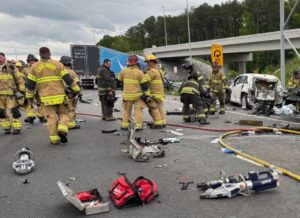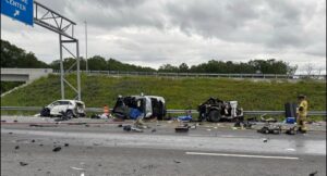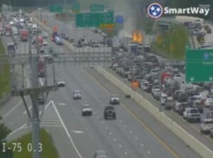 The crash involved six passenger vehicles and one tractor-trailer, with two cars igniting in flames.