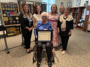 The Judge David Campbell Chapter was proud to recognize Mrs. Hooper with the Daughters of the American Revolution Woman in American History award and was treated to a brief tour by Mrs. Taylor Kilgore who highlighted the memorial’s latest acquisitions. In addition to the award for Mrs. Hooper, the chapter made a $500 donation to the Children’s Holocaust Memorial in her honor. They hope the funds will help ensure that this memorial continues to serve as a beacon of light and learning for many years to come.