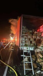 Upon arrival, firefighters found the tractor fully involved and spreading to the trailer. They immediately began suppression operations of the fierce fire. The blaze had managed to enter the trailer, and the roof had collapsed. This made suppression efforts difficult, as they had to vent the roof and sides to make an entrance.