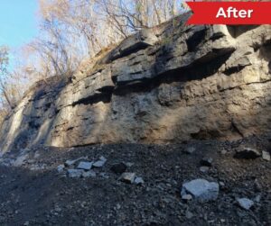 In the “after” photo, you’ll see a much more distinct overhang in the rock where the unstable rock was hammered away below it.