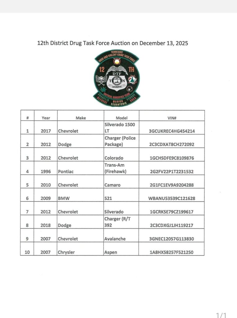 The 12th Judicial District Drug and Violent Crime Task Force will be having a public auction on Saturday, December 13, 2025. The auction will be conducted at the Marion County Training Center / Lawson Building located at 300 Ridley Drive, Jasper, Tennessee. Registration and vehicle viewing will begin at 8 am, with the auction starting at 9 am.