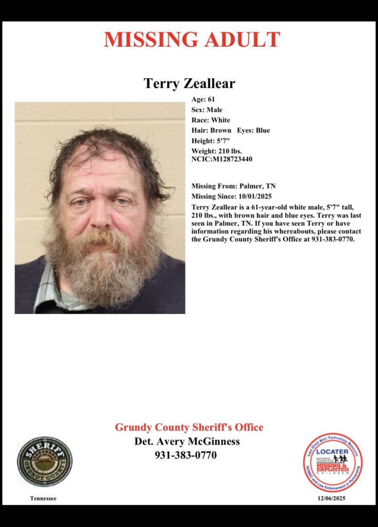 The Grundy County Sheriff’s Office needs assistance with locating a missing person. 61-year-old Terry Alan Zeallear was last seen on October 15th in Grundy County and has not been seen or heard from since. If you know of Terry’s whereabouts, please contact Chief Brown at 931-313-1188 or Detective McGinness at 931-383-0770.