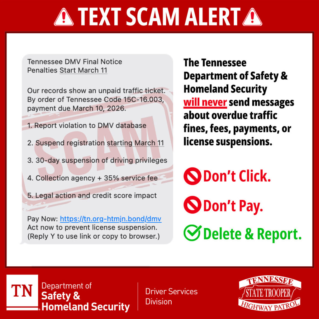 The Tennessee Department of Safety and Tennessee Highway Patrol are warning Tennesseans about new scam text messages claiming recipients have an “unpaid traffic ticket” and threatening their driving privileges. These messages are not real.