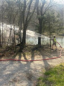Upon arrival, the area was on fire and spreading. Laying hose from both engines, the fire was quickly controlled. After suppression efforts firemen conducted overhaul of hot spots. In total, about an acre and a half burned. No injuries were reported.