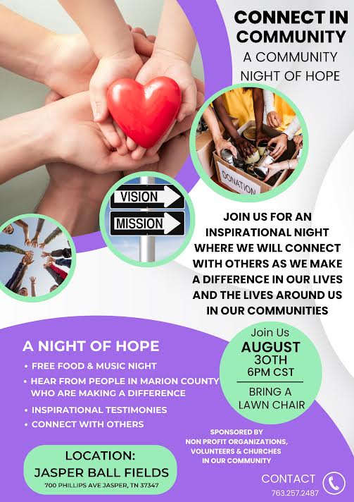 Groups involved so far: New Beginnings Church of Jasper, Jasper 1st Baptist, Jasper Church of the Nazarene, Blessed Inc, Cornerstone Food Ministry, Sleep in Heavenly Peace, Champion Recovery Center, Recovery All Ministry, Next Step Resources, Marion County Chamber of Commerce and South Pittsburg Mentorship program. Others may be joining.