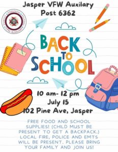 Jasper VFW Auxiliary Post hosting ‘Back to School’ event Saturday, July 15th