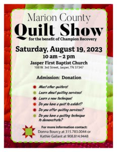 Marion County Quilt Show for the benefit of Champion Recovery will be held on Saturday, August 19th from 10am-2pm at Jasper First Baptist Church — 108 W. 3rd Street, Jasper, TN. Admission is by donation. Meet other quilters, learn about quilting services, learn new techniques… If you have a quilt to exhibit or offer quilting …
